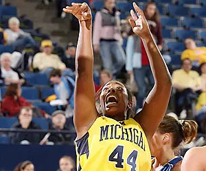 A basket inside by sophomore Krista Phillips(Saskatoon, Saskatchewan/Aden Bowman Collegiate HS) at the 15:48 mark of the second half extended the U-M lead to a game-high 22 points, 50-28, but the Hurricanes responded with nine unanswered points to cut the deficit to 50-35 with 11:52 to go.