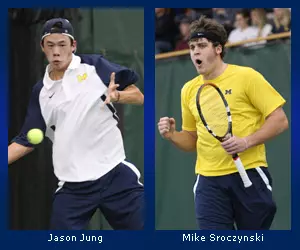 COLUMBUS, Ohio -- Sophomore Jason Jung(Torrance, Calif./West Torrance HS) and junior Mike Sroczynski(Chatham, N.J./Laurel Springs School) of the University of Michigan men's tennis team claimed the doubles title at the Wilson/ITA Midwest Regional Championships today (Monday, Oct. 20) at Ohio State's Varsity Tennis Center. The top-seeded pair defeated No. 5 seed Austen Childs and Simon Childs from Louisville, 8-4, for Michigan's first-ever regional championship.