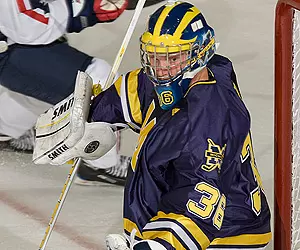 Michigan controlled play during the first 10 minutes of the game, due in part to a power play that began at 1:32. Its two best chances came after the man-advantage from freshmen David Wohlberg(South Lyon, Mich.) and Robbie Czarnik(Washington, Mich.). Charging the net, Wohlberg chipped a crossing pass just high and wide right of the goal. Minutes later following a faceoff win, Czarnik quickly snapped a shot high on Connelly, who knocked the puck off target with his right shoulder.