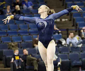 In the first rotation, Michigan got the call on floor where U-M put up a team score of 49.100 to take an early near half-point lead over second-place Pitt. Lieberman equaled a career high with a 9.900 in the final routine of the rotation, while Botterman's 9.875 extended her streak of 9.875 or better floor routines to five meets. Bruck went 9.850 and senior Nellie Kippley(St. Cloud, Minn./Tech) added a 9.825 score to the tally.