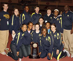 FAYETTEVILLE, Ark. -- Junior co-captain Bettie Wade (Northville, Mich./Farmington), senior co-captain Nicole Edwards (Winnipeg, Manitoba/Vincent Massey) and junior Geena Gall (Grand Blanc, Mich./Grand Blanc) of the No. 4-ranked University of Michigan women's track and field team each earned All-America honors -- Wade in the pentathlon, Edwards in the mile run and Gall in the 800-meter run -- Saturday (March 15) at the NCAA Indoor Championship at the Randal Tyson Track Center. These outstanding performances, combined with junior co-captain Tiffany Ofili's (Ypsilanti, Mich./Ypsilanti) national title in the 60-meter hurdles Friday night (March 14), led Michigan to a third-place team finish with 39 points -- the highest finish in U-M history at the NCAA Indoor Championships.