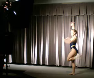 With a backlog of athletes and coaches, Lindsey and head coach Bev Plocki had to wait for their turn in the interview chair. Before her interview the crew asked Lindsey to run through some gymnastics poses that they plan to use for the opening championships montage and for bumpers during the broadcast.