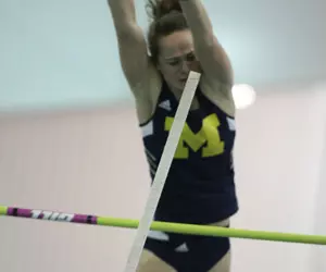 Conkle recorded a top height of 11-9 3/4 (3.60m) to take third-place honors for the Maize and Blue. Junior/sophomore Abbey Breidenstein(Zionsville, Ind./Zionsville Community) also reached 11-9 3/4 (3.60m) and, based on tie-breakers, finished fifth. Junior/sophomore Carly Schiffer(Ovid, Mich./Ovid-Elsie) cleared the bar at 11-3 3/4 (3.45m) to earn an eighth-place finish. Duke's Amy Fryt recorded a top effort of 12-11 1/2 (3.95m) to win the competition.