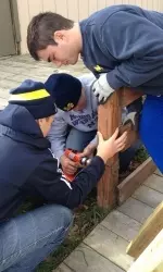 The Wolverines boasted nearly 100 percent participation on Saturday, bringing out 30 wrestlers and four coaches to work on tasks like weeding and planting bulbs in several garden areas, painting playground equipment, rebuilding railings around portable classrooms and trimming back trees and shrubs. They split off into several groups across the school grounds, organizing around their skill sets. Some had backgrounds in painting, others in landscaping and construction. After four hours of work the grounds at the elementary school were transformed.