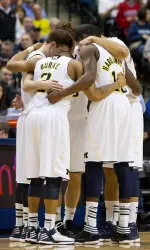 7:05 -- Coach Beilein socializes with the players while the families go through security. He stops to talk with administrators about the NCAA play-in games and the NIT games played last night.