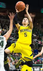 Senior captain Nicole Elmblad sealed the outcome by hitting four clutch free throws in the final two minutes. The Spartans cut what had been a 22-point lead with 17:06 remaining to a tenuous, six-point lead with 1:58 left. But that's when Elmblad hit her first two free throws, and she nailed two more with 1:15 remaining for a 68-59 lead that put the Wolverines back in control.