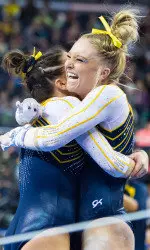 Sophomore Olivia Karas, who was one of the top-ranked vaulters in the nation last year, had a huge Yurchenko 1 1/2 with a stuck landing for a career-high 9.975. Vault was the top event for the Wolverines as they posted a 49.450 as a team.